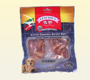 产品名称:鳕鱼圈缠肉 规格型号:180g 每箱数量:30袋 公司网址:www.luspet.com
